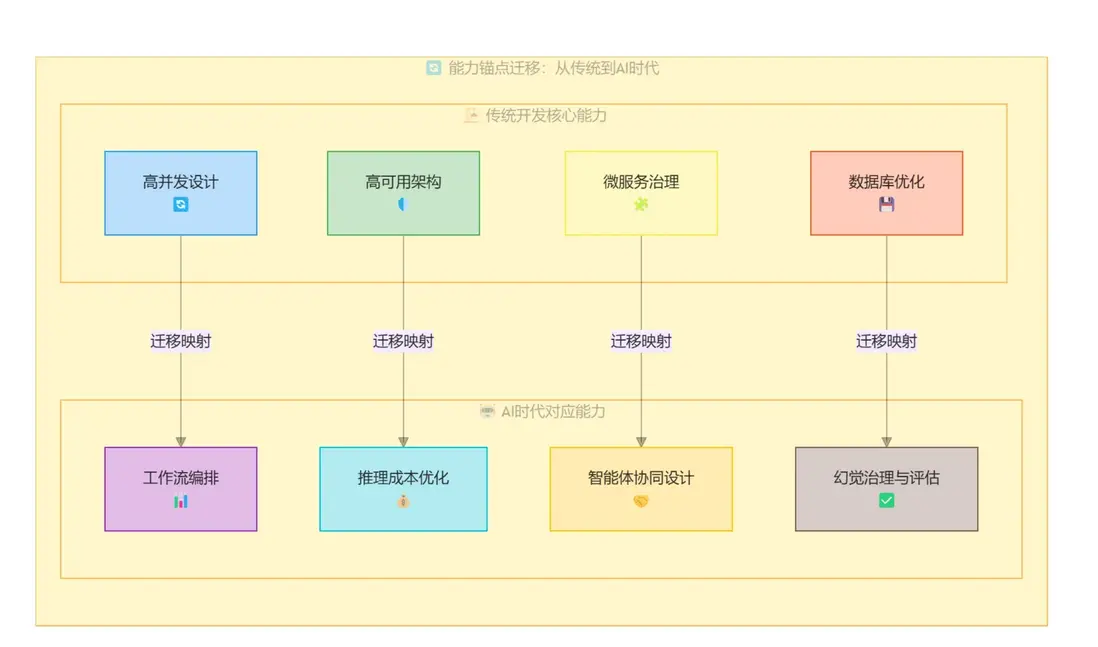 - 能力遷移:你擅長的 “高併發”、“高可用”架構思想,在AI時代等價於 “複雜工作流編排與推理成本優化” 。你的工程化優勢,將在AI落地階段全面爆發。