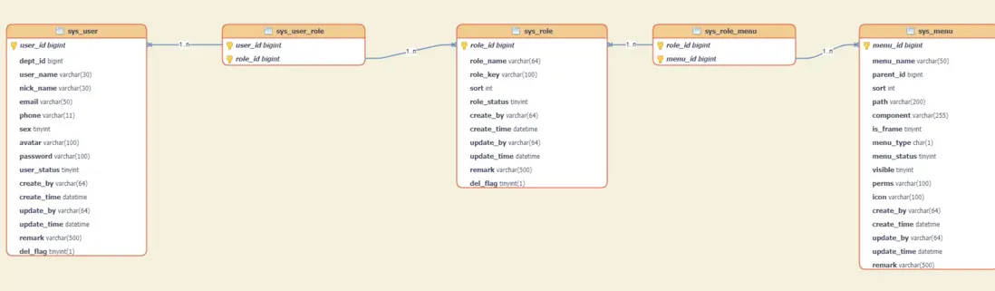 用户與角色之間是多對多的關聯方式,即一個用户可以擁有多個角色,一個角色可以分配給多個用户。角色與權限之間也是多對多的關聯方式,即一個角色可以擁有多個權限,一個權限可以分配給多個角色。用户角色關聯表、角色菜單關聯表結構如下,