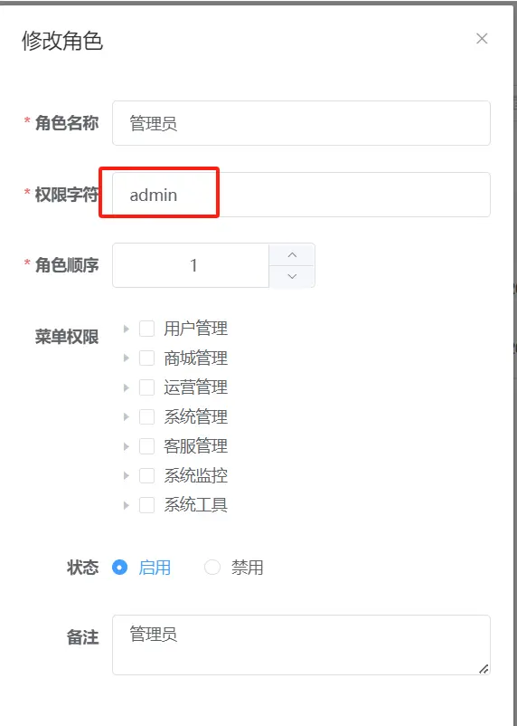 角色按照功能模塊進行命名,如商品管理、訂單管理、營銷管理等。角色可以分為普通角色和超級管理員角色,普通角色可以擁有部分或全部功能模塊的權限,超級管理員角色可以擁有所有功能模塊的權限,並且可以管理其他用户和角色。表結構如下