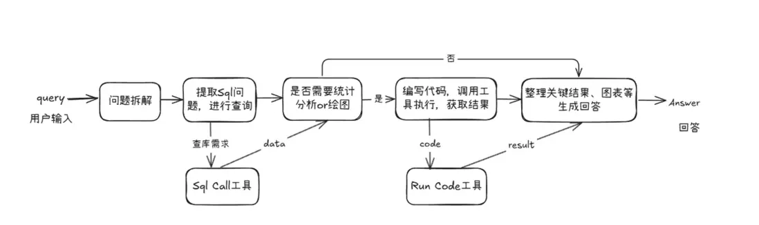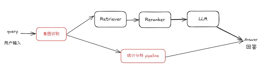 在複用現有模塊的基礎上,我們新增了用於數據庫查詢、統計分析和圖表生成的統計分析 pipeline。該 pipeline 與 RAG pipeline 並行運行,並通過一個意圖識別模塊進行統一調度。該模塊負責判斷用户查詢屬於知識問答還是統計分析,從而引導請求進入合適的處理流程。