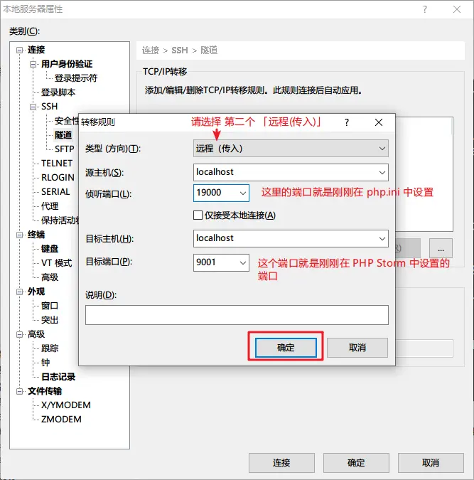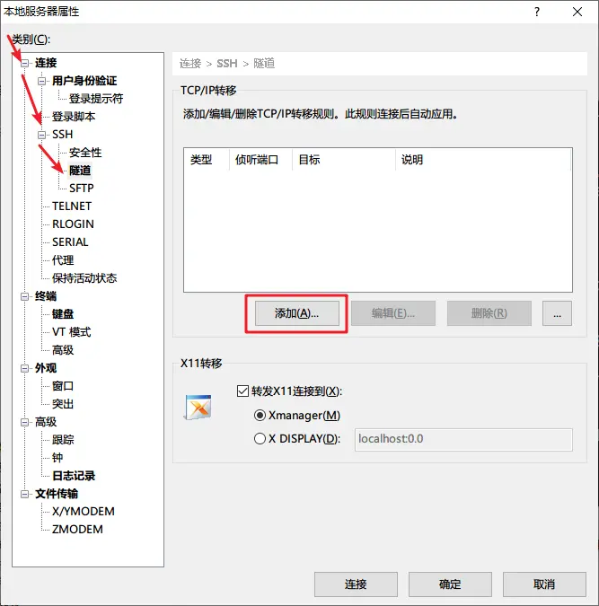點開屬性,依次選擇 連接 >SSH>隧道 > 添加