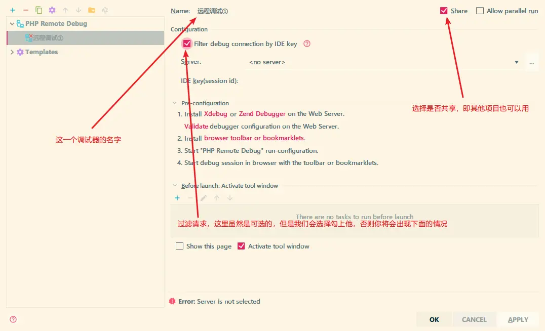 emm,過濾請求那個框一時找不到,就描述一下吧,當我們有開啓多個 PHP Storm 窗口時,如果有一個以上的 窗口都啓用的 Xdebug ,那麼,IDE 此時將會不知道該調用哪一個而發生矛盾,你可以在彈出的窗口中選擇使用哪一個項目。