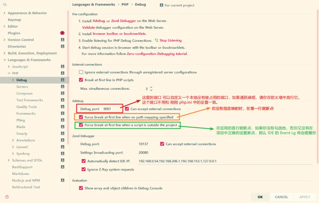 ; 調試連接端口 請記住這個端口,後續會用到。此配置項默認值為 9000 ,但是通常 9000 端口被 fpm 佔據 ,故更換端口。