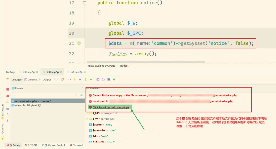 這個主要是表現在 使用追蹤時,突然就跳出了循環,明明下面還有斷點,這是因為一些項目中使用了 自定義一些複雜的表達式來引入文件,導致沒法映射導致,比如 微擎 。這時候就需要單步驟調試,到出錯的位置,Xdebug 的 Debugger 窗格會為我們提示。