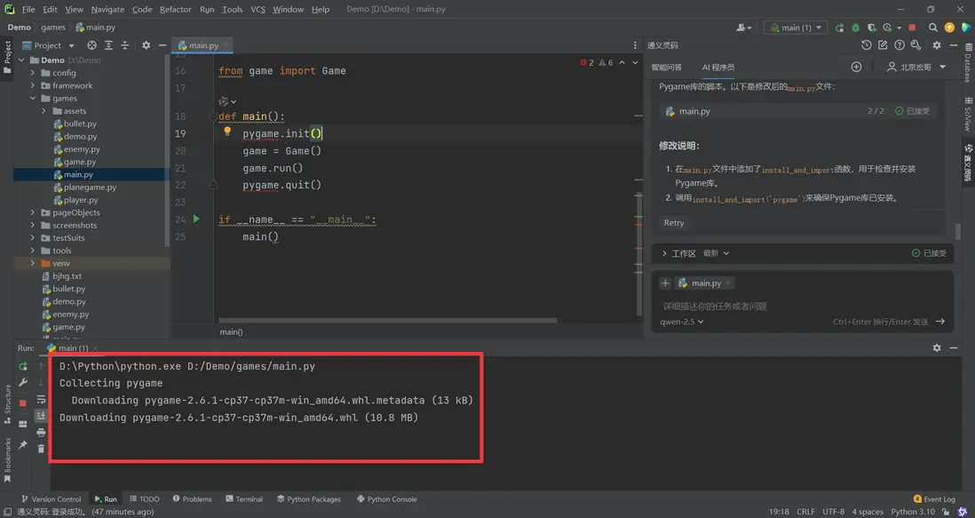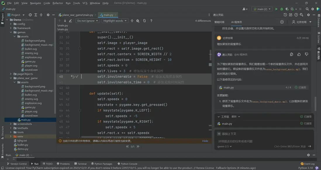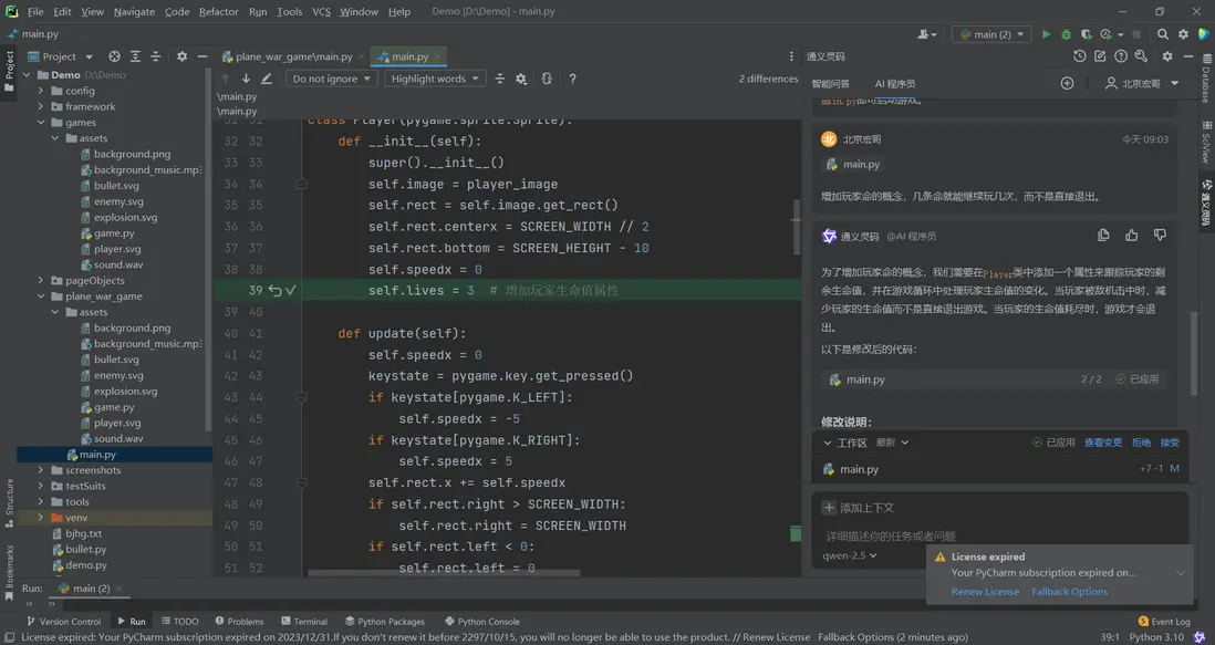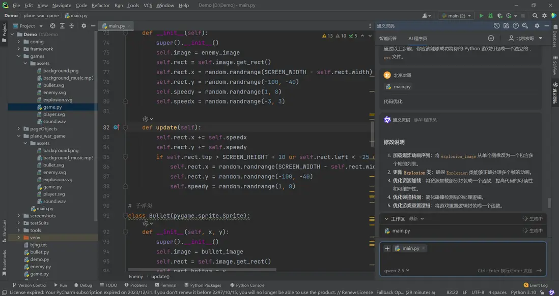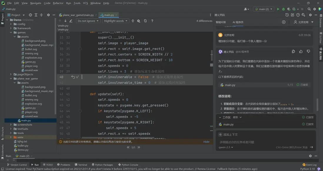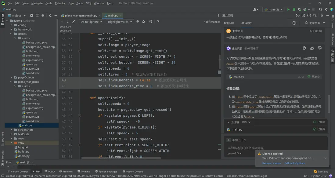 1.實際運行中交互效果問題,直接向AI程序員提問,幫你完善。比如我遇到的問題:”子彈不跟着飛機移動”,給出的修復代碼直接採用即可!如下圖所示: