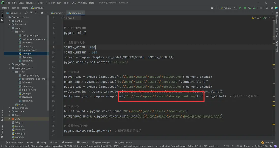 生成飛機大戰遊戲完整代碼,用pygame運行,記得不是簡單的遊戲框架代碼哦,而是完整代碼,利用飛機大戰文件夾中的遊戲素材: bullte.svg(子彈圖), enemy.svg(敵機圖),explosion.svg(爆炸素材圖)、player.svg(我方機圖)、sound.wav(子彈聲音)、background_music.mp3(背景音樂),如下圖所示: