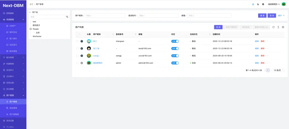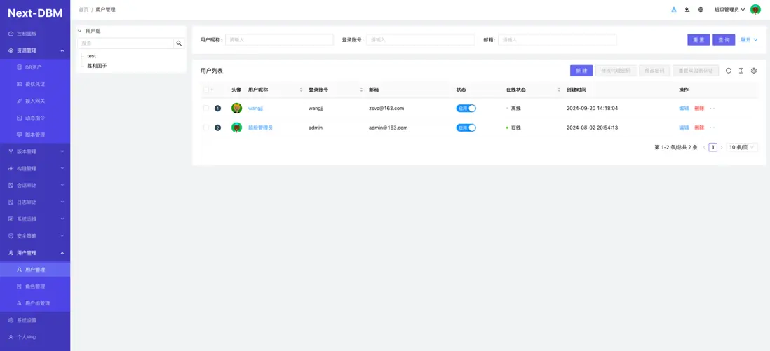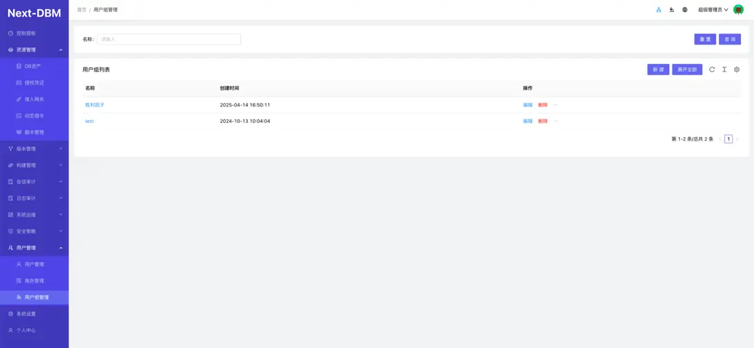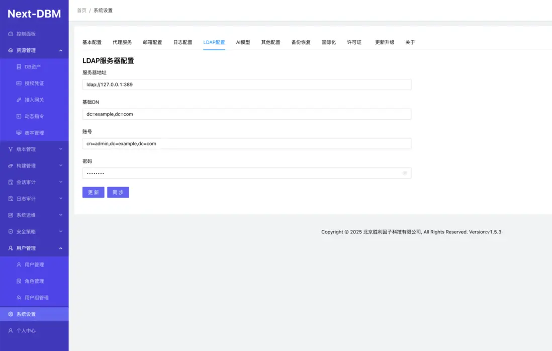 官網 https://doc.aiputing.com/dbm 企業輕量級數據庫審計版本管理系統 Next-DBM 支持數據庫連接日誌審計,代理權限統一管理。 數據庫堡壘機, 支持數據版本管理。支持數據庫腳本自動構建部署實施。 支持WEB操作數據庫基本管理功能。 LDAP數據同步 系統設置LDAP配置輸入正確的LDAP信息點擊更新後再同步 同步前用户組只有兩個組 用户也只有兩個 同步成功後自動將LDAP中的機構和用户一併同步完成。