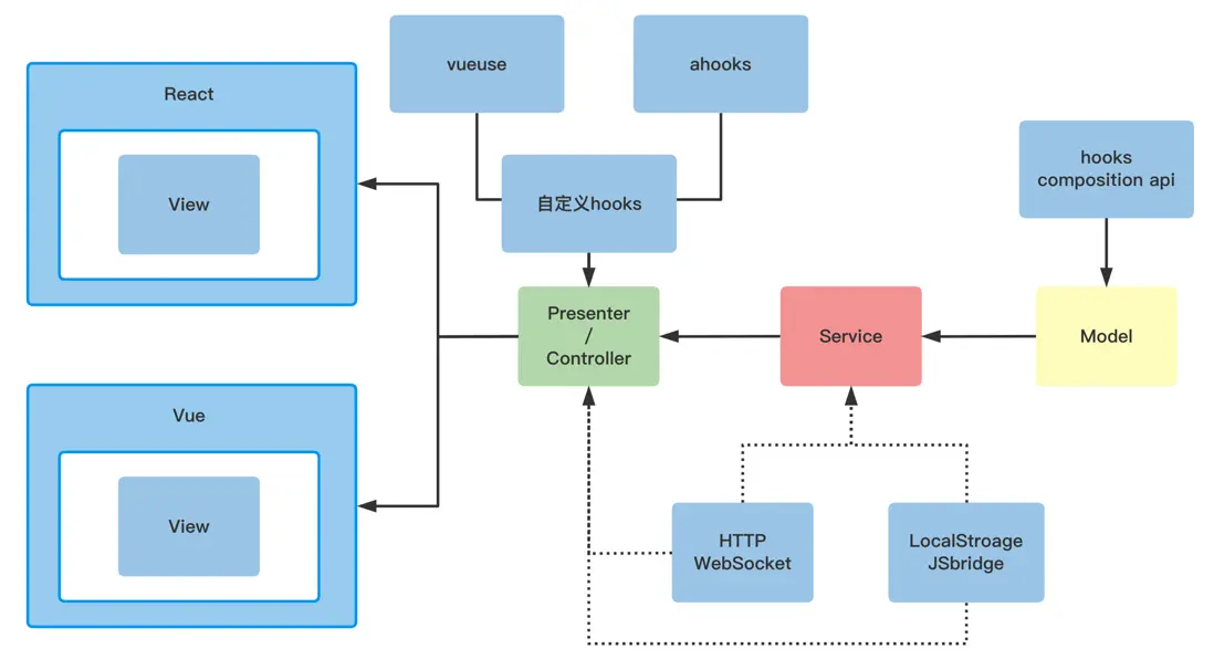 看上面的 model 代碼,其實就是一個自定義 hooks。也就是説我們在 model 層直接依賴了框架 react 或者 vue,違反了整潔架構的規範。這是從 開發體驗 和 技術選型 兩方面考慮,要在不引入 mobx,@formily/reactive 等第三方庫的前提下實現修改 model 數據就能直接觸發視圖的更新,使用自定義 hooks 是最便捷的。