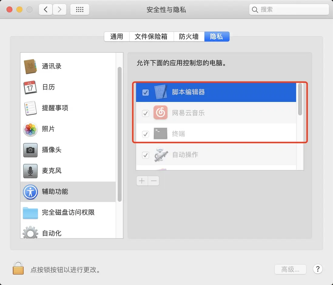 $v_script就是要執行的命令,這裏藉助了Mac自帶的腳本功能,因此無法跨平台,如果是在當前tab頁打開連接就可以直接執行sshpass命令。這裏也要打開腳本輔助功能權限,在系統偏好設置中找到安全與隱私,在輔助功能中將腳本編輯器和終端加進去