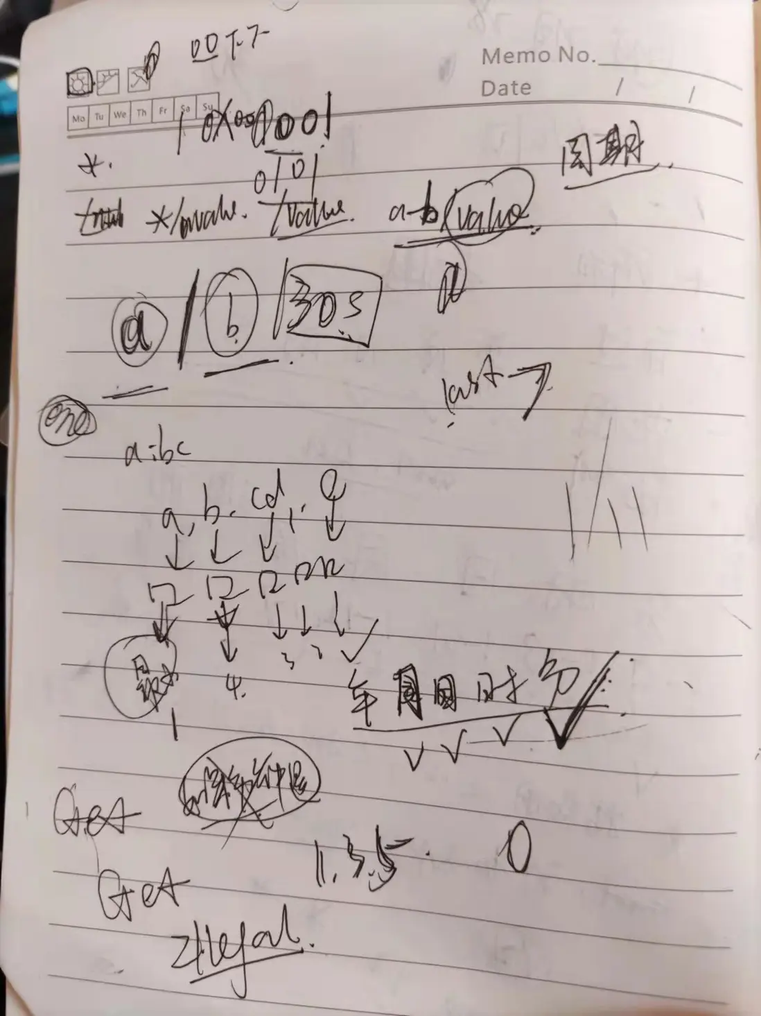 在實際項目中我們也可能會碰到類似這種稍微有點複雜的業務開發,面對這種開發時,一定一定不要馬上編碼,在沒有把數據結構和算法理清楚的前提下貿然編碼,肯定是有問題的,這個解析器説簡單也不簡單説複雜也不復雜,但是數據結構和算法也是花了我一天時間在筆記本上推敲,建議程序員都要有個筆記本,把思路在紙上面寫清楚,寫代碼只是把紙上面的東西用代碼實現而已(實際上編碼+調試不到一小時),附上醜陋到只有我和上帝能看得懂的筆記