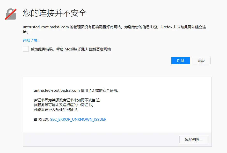 當 Firefox 連接到一個安全的網站時(網址最開始為“https://”),它必須確認該網站出具的證書有效且使用足夠高的加密強度,以充分保護您的隱私。如果證書無法通過驗證,或加密強度過低,Firefox 會中止連接到這個網站,並向您顯示SSL證書錯誤信息頁面:“你的連接不安全”。