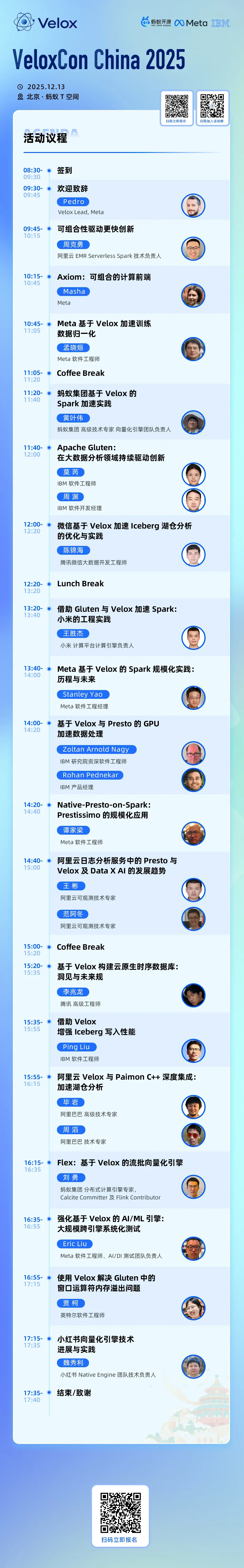大會最終議程現已公佈,無論你正在評估 Velox 的適用性,還是已在生產中使用並希望深入優化,都能在這裏找到有價值的參考。