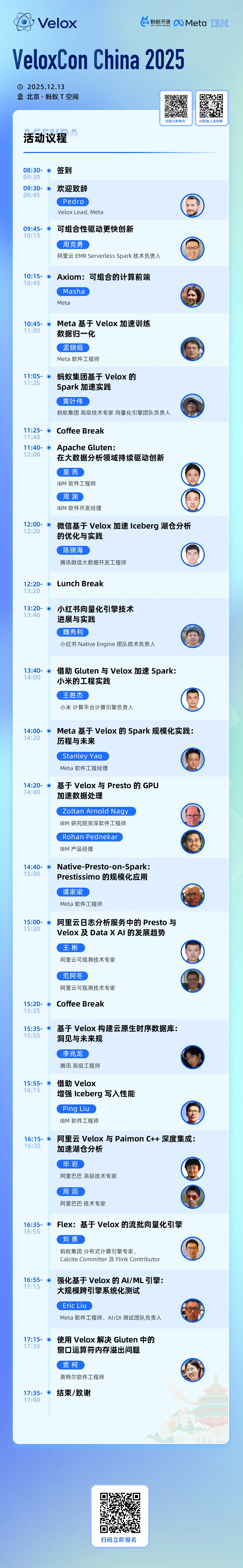 現在,深入探索 Velox 生態的契機已然到來——首屆 VeloxCon China 2025 將於 12 月 13 日在北京舉辦。作為 Velox 社區的頂級技術盛會,本屆大會將匯聚來自 Meta、螞蟻集團、IBM、英特爾、阿里巴巴、騰訊、小米、小紅書等團隊的核心開發者,通過分享一系列生產環境下的實戰經驗與架構演進,完整呈現 Velox 驅動下一代數據基礎設施的技術全景與社區生態。