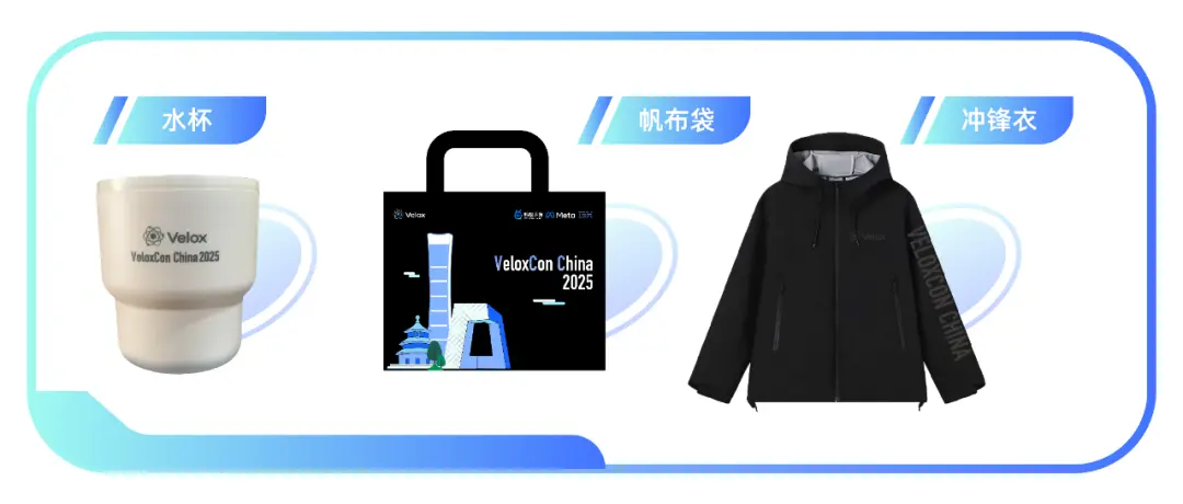 作為首屆 VeloxCon China 2025 的特別心意,我們為現場參會者精心準備了大會專屬伴手禮。一款簡約趁手的定製水杯、一隻結實耐用的帆布袋,以及一件輕便保暖的衝鋒衣——從會場交流到日常使用,希望它們參與你每一個靈感迸發的時刻。數量有限,請在簽到時領取這份專屬紀念。