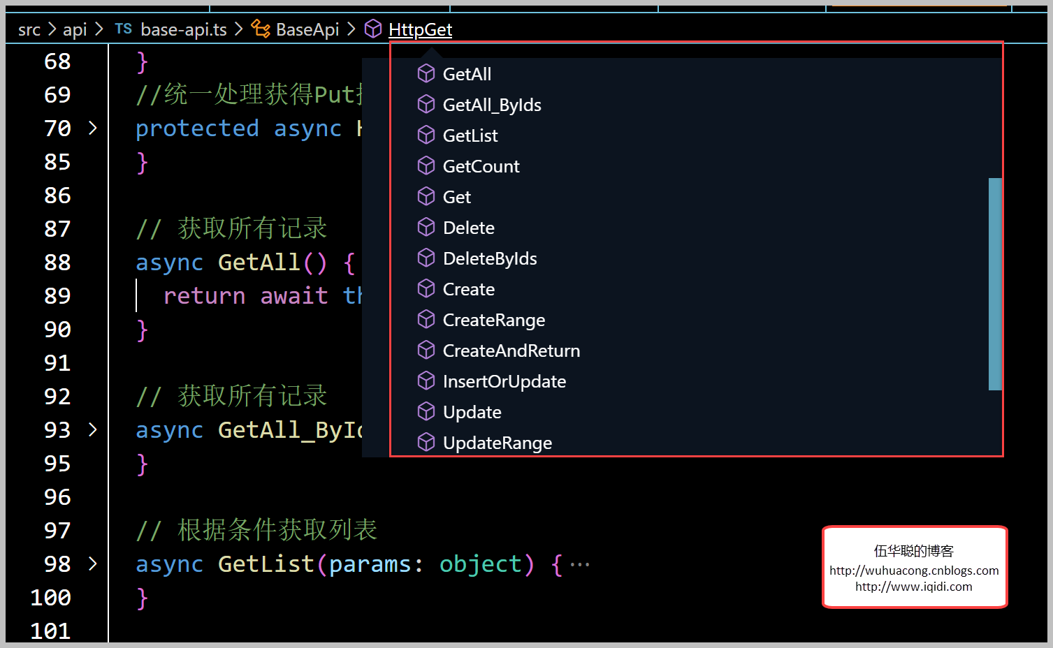 我們已經在BaseApi的ES6類裏面定義了對應Web API基類裏面的操作方法,如下所示。