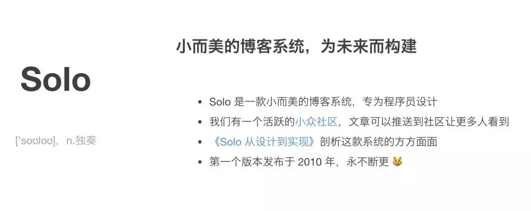 Solo,號稱是一款小而美的動態博客系統,專為程序員設計。最大特點就是自帶社區,自己的文章可以發送到社區中。社區回帖和博客評論進行聯動。讓每一個博客不是孤島,而是滿天相互聯繫的星星。