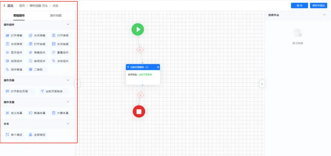 動作卡片是給組件配置的事件,可以通過拖拽多個相應的動作卡片和編排這些動作卡片的順序來實現組件事件,滿足動態交互的效果。比如需要實現頁面跳轉的效果,就將當前頁面跳轉卡片拖拽到畫布中,使用箭頭將畫布中的首尾圖標進行連接,並配置跳轉到哪個頁面即可。
