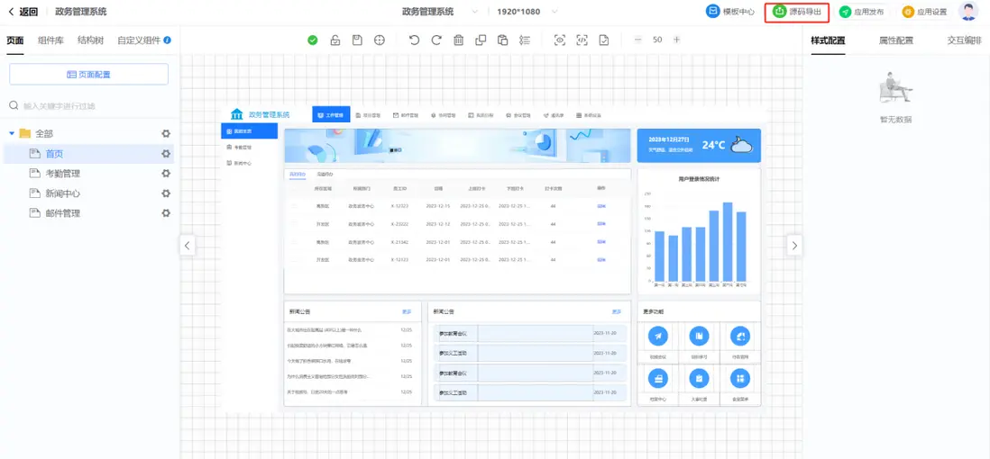 源碼導出就是將搭建的模板導出對應的前端代碼,代碼是vue格式的,需要對應的環境才能運行。點擊浮木雲頁面中的源碼導出,如下圖: