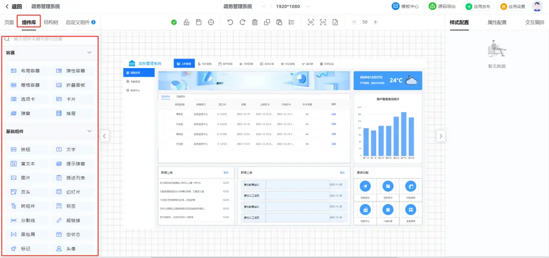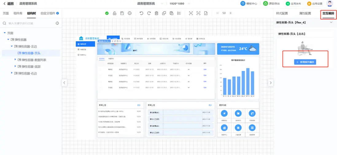 交互編排就是給組件配置事件。通過給不同的組件配置不同的事件來實現頁面的動態交互效果;例如:點擊某個按鈕就進行頁面的跳轉、點擊按鈕就有彈窗彈出。