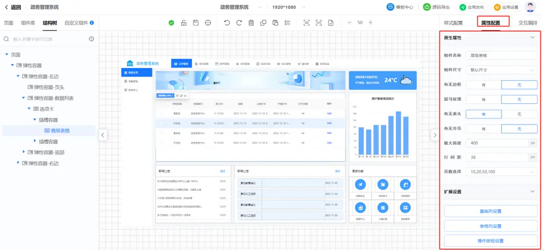 屬性配置就是給被選中的組件配置屬性。不同的組件有不同的屬性,可以通過配置原生屬性、擴展設置等屬性來調整組件,從而調整搭建的頁面。原生屬性中就是設置組件名稱、尺寸等屬性。在表格的擴展設置中可以設置表格數據、表格列、操作按鈕設置等。