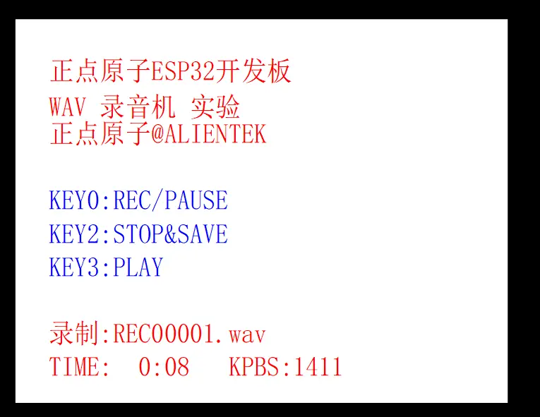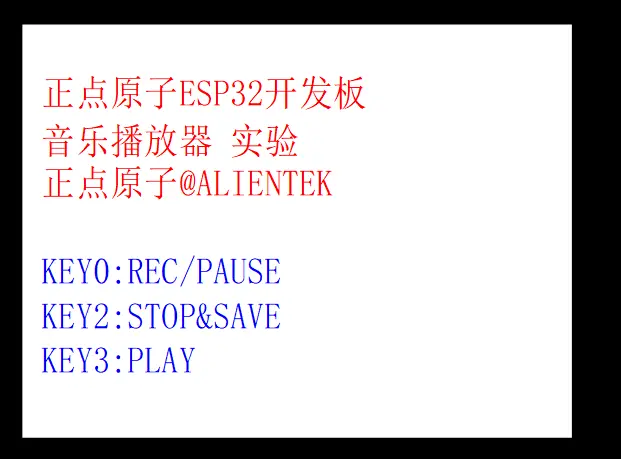 在錄音的時候按下KEY0則執行暫停/繼續錄音的切換,通過LED指示錄音暫停。通過按下KEY2,可以停止當前錄音,並保存錄音文件。在完成一次錄音文件保存之後,我們可以通過按KEY3按鍵,來實現播放這個錄音文件(即播放最近一次的錄音文件),實現試聽。