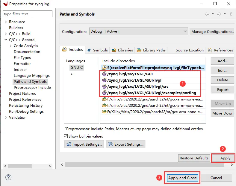 將所有頭文件添加完成之後,點擊Apply應用之後點擊Apply and Close,確認並關閉選項卡,移植LVGL只需要添加關鍵的頭文件路徑即可,因為lvgl.h文件已經為我們省去了很多包含頭文件的操作,添加的頭文件路徑如下圖所示: