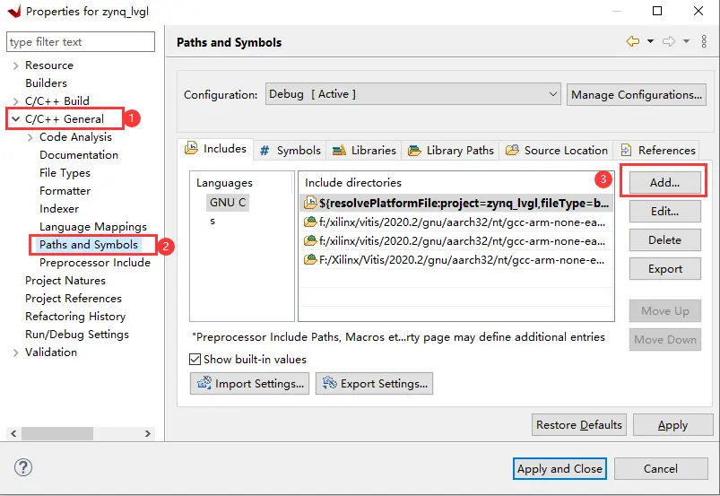 在打開的Properties選項卡中選擇C/C++ General選項下的Paths and Symbols,Add添加頭文件路徑,如下圖所示: