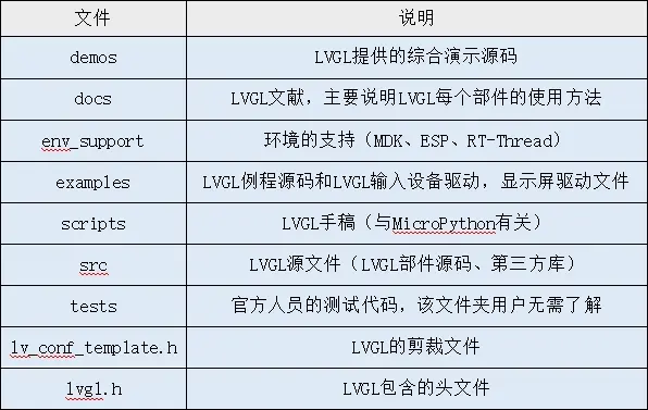 由上圖可知,LVGL 源碼的目錄下有很多文件和文件夾,但用户並不需要完全瞭解它們,我們只需要瞭解與移植相關的部分即可。各文件夾和文件的功能如表 1.1.1所示: