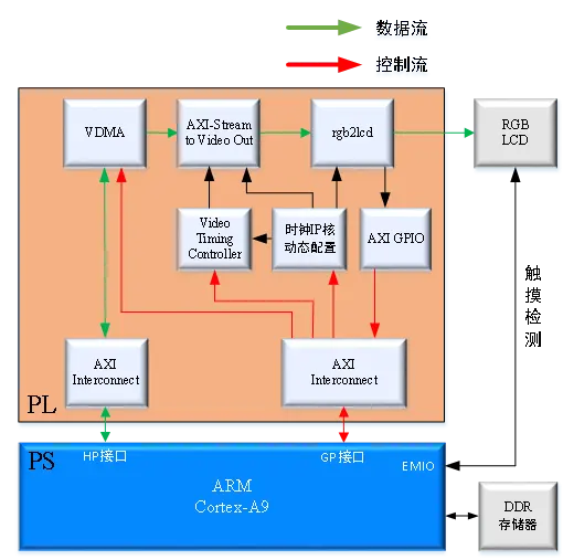 由上圖可知,首先我們需要在PS端寫彩條數據到DDR中,然後PS需要通過AXI Interconnect IP核與AXI_HP端口進行連接,用於VDMA IP和PS之間高速傳輸數據。VDMA IP核將DDR3中的視頻或圖像數據傳輸給AXI4-Stream to Video Out IP核,AXI4-Stream to Video Out IP核在VTC IP核的控制下,把AXI4-Stream格式的數據轉換成視頻輸出的數據格式(如RGB888),並將輸出的視頻數據流連接至RGB2LCD IP核(rgb2lcd)的輸入端。最後PS通過AXI GPIO IP核獲取LCD屏ID,並根據獲取到的ID配置VDMA IP核的幀緩存空間大小、讀通道等以及配置VTC IP核的輸出的時序參數。由於不同分辨率的LCD屏其驅動時鐘不一樣,因此本次實驗需要將時鐘配置成動態時鐘,PS根據LCD屏的ID配置時鐘IP輸出不同的時鐘。再通過加入EMIO來檢測LCD屏觸摸狀態的功能,這一部分功能是由PS端來實現的。PS不斷地掃描LCD的觸摸狀態,包括是否有觸摸動作發生、當前觸摸點的座標等信息,根據掃描到的信息來決定是否向VDMA的Frame Buffer中寫入數據以及向Frame Buffer的哪個地址寫入數據等等。然後位於PL端的VDMA讀取邏輯不斷地將Frame Buffer中存儲的數據送給LCD進行顯示。
