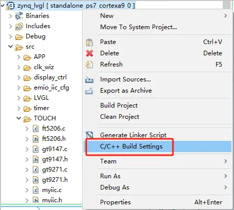 右鍵應用工程選擇C/C++ Build Settings選項,如下圖所示: