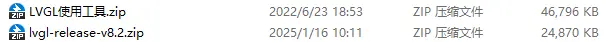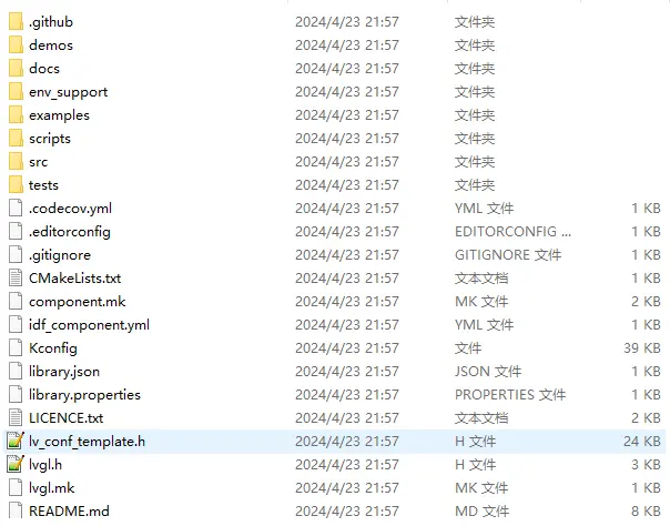上圖中,“LVGL使用工具.zip”壓縮包裏存放了 LVGL 相關的離線轉換工具,這些離線工具是廣大愛好者根據 LVGL 的字庫定義規則和圖片的處理特性而編寫的軟件;“lvgl-release-v8.2.zip”壓縮包裏存放了LVGL圖形庫的V8.2 版本源碼,其解壓後如圖 1.1.3所示: