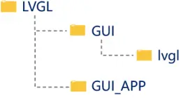 我們在工程目錄下新建一個LVGL文件夾,並在該文件夾下面新建GUI文件夾以及GUI_APP文件夾,最後在GUI文件夾下新建lvgl文件夾。具體的文件夾結構如圖 1.4.4所示:
