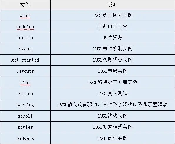 該文件夾主要包含LVGL部件實例、動畫實例、其它第三方庫實例以及輸入設備和顯示器驅動文件等內容,具體如表 1.1.2所示: