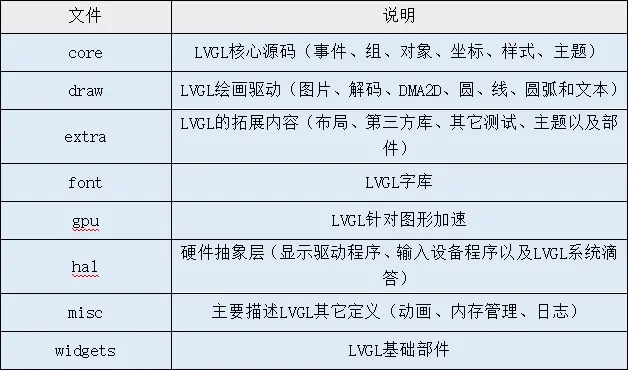 該文件夾主要包含LVGL源文件(部件源碼、多種解碼庫),具體如表 1.1.3所示: