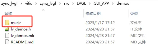把demos文件夾複製到LVGL/GUI_APP路徑下,只保留music文件夾,如下圖所示: