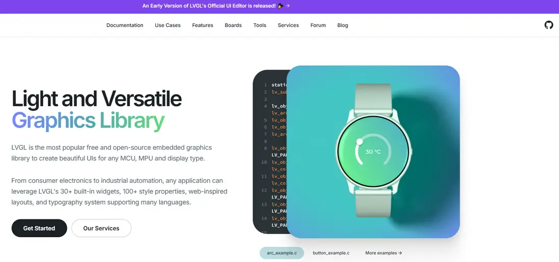 綜上可知:LVGL是一款具有豐富部件,具備高級圖形特性,支持多種輸入設備和多國語言,獨立於硬件之外的開源圖形庫。官方地址為:LVGL — Light and Versatile Embedded Graphics Library,該網頁主要包含用户文檔、圖片轉換器和字體轉換器,該網頁打開後如圖1.1.1所示: