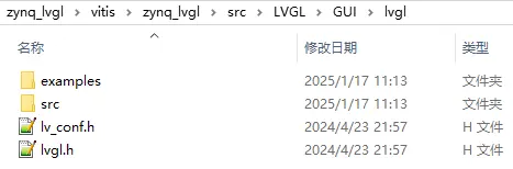 將硬件導出至Vitis,打開Vitis後,我們創建一個Application Project,應用工程名為“zynq_lvgl”,本實驗和“RGB LCD畫板”實驗相比,源文件下新增了timer和LVGL文件夾,分別是定時器驅動代碼和LVGL庫文件,timer文件夾的內容可以直接拷貝“定時器中斷實驗”的代碼。文件代碼結構如下圖所示: