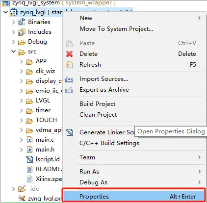 添加LVGL源碼的文件夾路徑,包含源碼文件,右鍵選擇應用工程,選擇Properties選項,如下圖所示:
