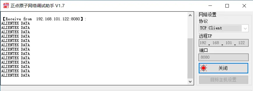 在確保網絡連接正常後,可以通過按下開發板上的KEY0按鍵來發送數據至網絡調試助手。當網絡調試助手接收到“ALIENTEK DATA”字符串時,它會在顯示區域展示這個信息。此外,用户還可以在調試助手的發送區域自行輸入要發送的數據,然後點擊發送鍵,將數據發送至ESP32-S3設備。此時,ESP32-S3的串口將打印接收到的數據,具體操作和輸出如下圖所示。