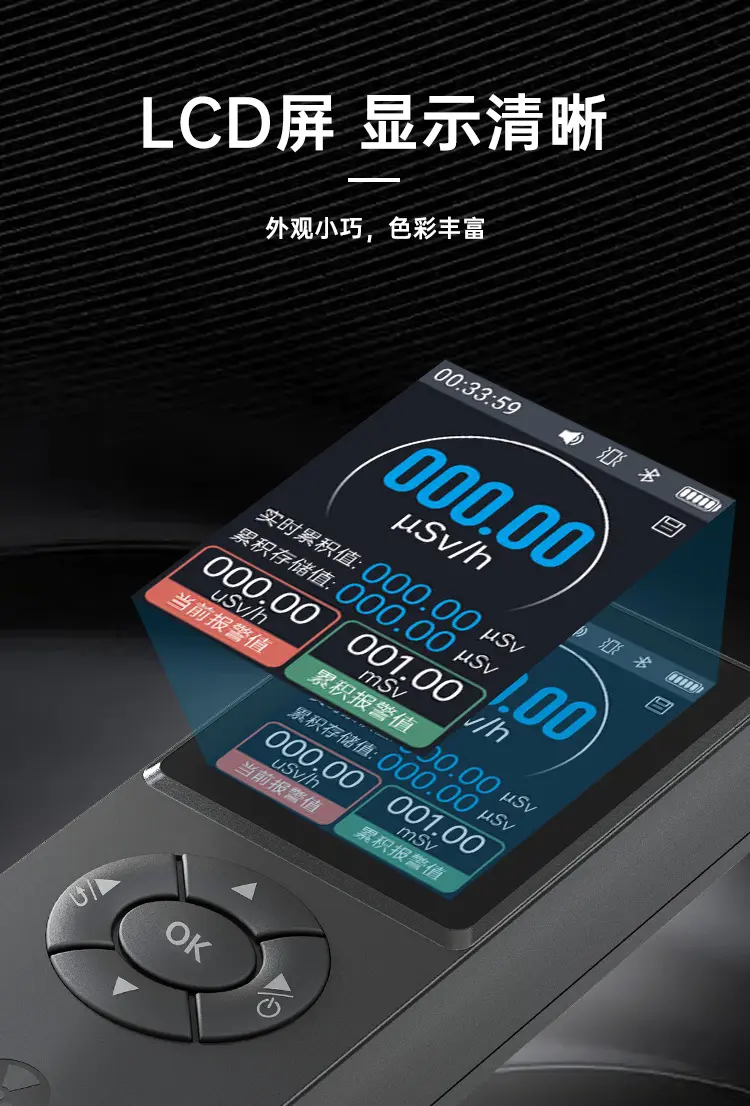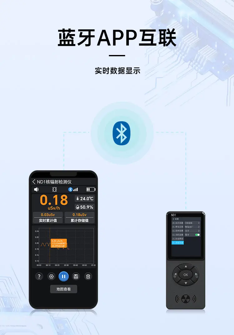 支持藍牙APP數據互聯,實時數據顯示,支持參數設置,時間同步到儀器;支持地圖查看功能,實時顯示行動軌跡,軌跡顏色隨輻射值量級提高而變色,直觀明瞭;地圖數據可回查,瞭解經過區域的輻射值變化,方便規避危險區域。