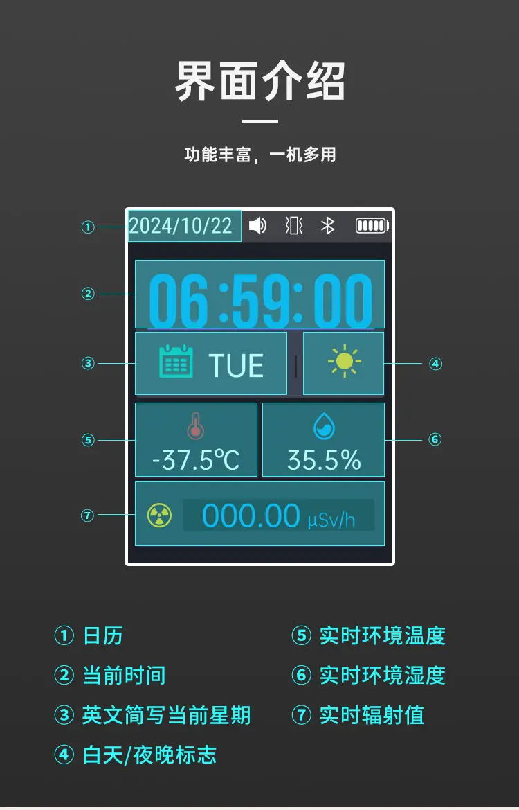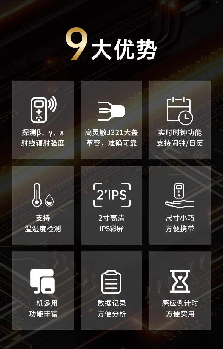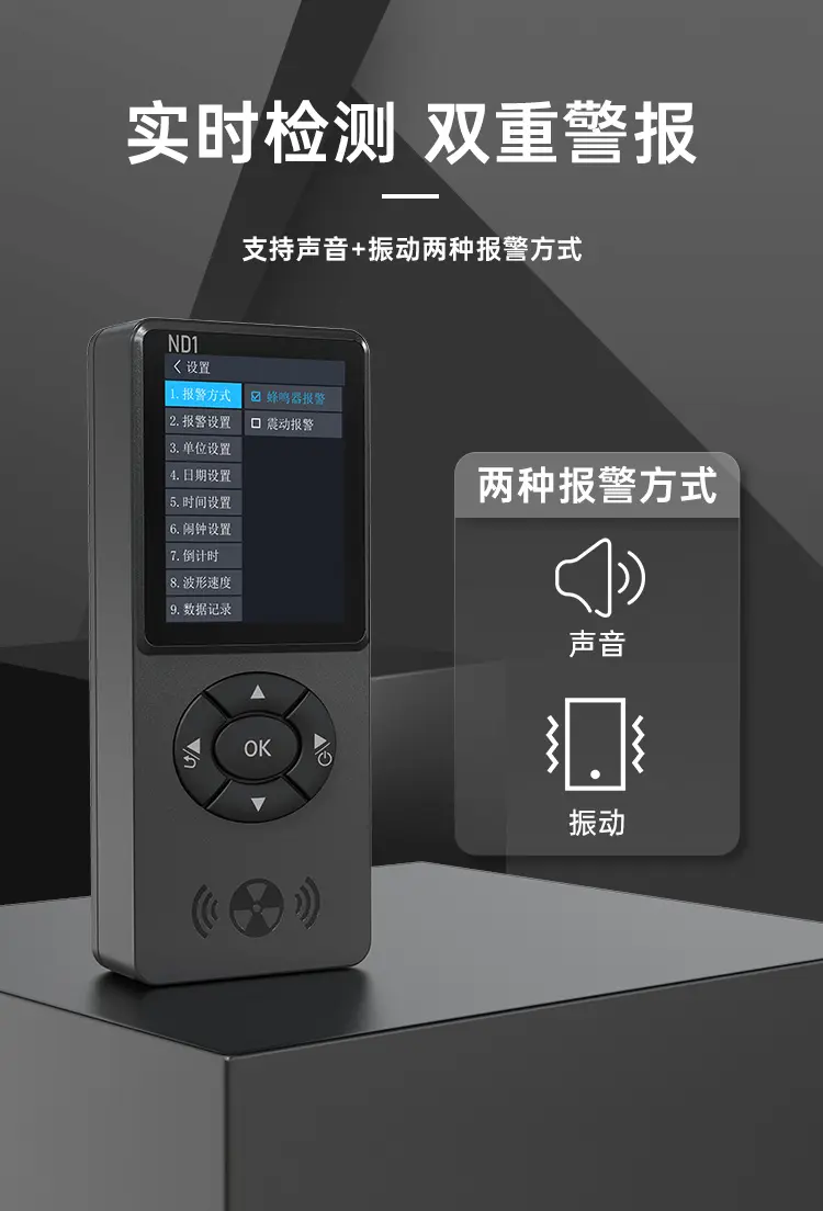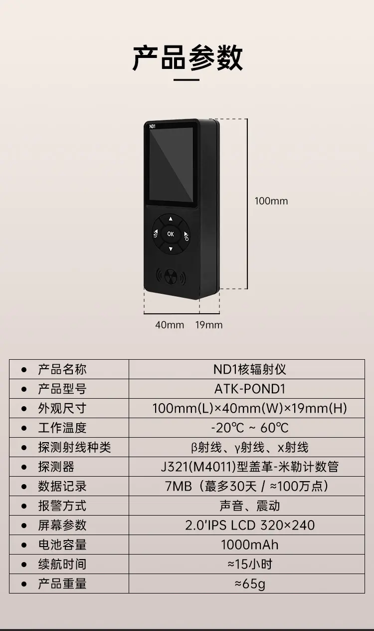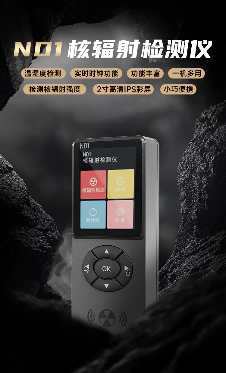 適用範圍廣,功能豐富,一機多用,可玩性高;深圳計量院校準證書,權威機構檢測認證;高靈敏J321大蓋革管,準確可靠;ND1支持約100萬個輻射值記錄,U盤數據導出,方便分析;支持手持感應功能,方便好用;報警方式與閾值可調,不錯過危險警告;支持倒計時功能,3D感應,方便使用。