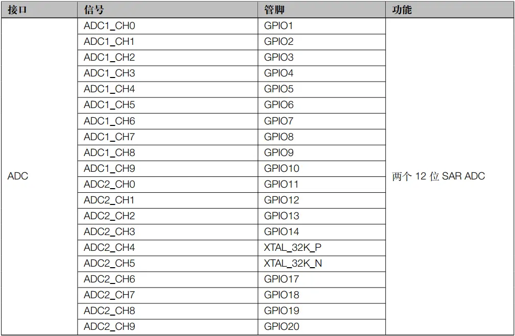 ESP32-S3集成了兩個12位SAR ADC,ADC1和ADC2,支持20個模擬通道輸入。這20個模擬通道輸入對應着具體的IO,並不是隨意的IO都有模擬輸入功能,具備模擬輸入功能的引腳如下表所示。