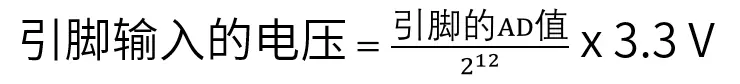 ESP32-S3的ADC模塊的分辨率為12位,所以AD轉換後的值範圍為0~4095。由於ESP32-S3的工作電壓為3.3V,所以當AD值為4095時,對應的電壓為3.3V;當AD值為0時,對應的電壓為0V。對於AD值和電壓值,這裏就會有一個簡單的關係,如下所示。