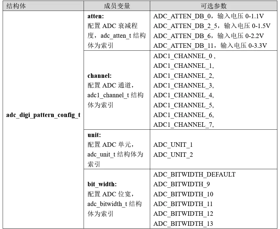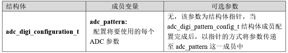 該函數使用adc_digi_pattern_config_t以及adc_digi_configuration_t類型的結構體變量傳入,該結構體的定義如下所示: