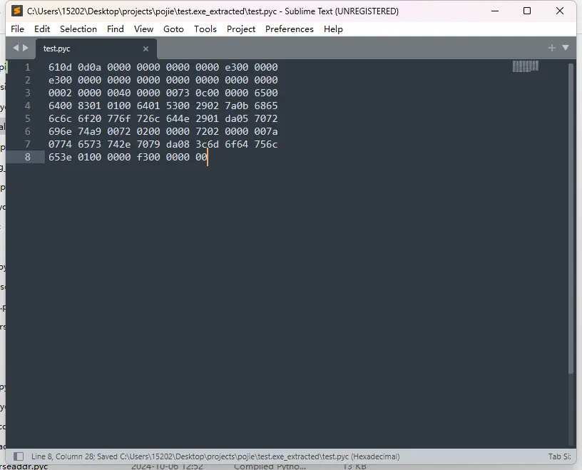 8. 再打開PYZ-00.pyz_extracted文件目錄,隋便找一個.pyc文件同樣的方式進行打開,複製其第一行16進制的數據粘貼到test.pyc的第一行,保存即可