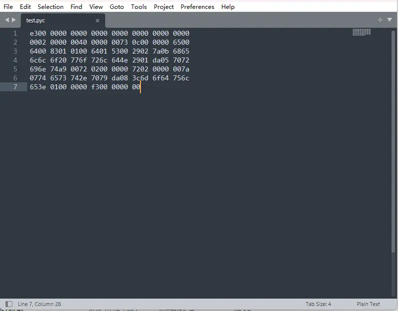 7. 使用源代碼或者文本編輯器,以16進制的方式打開 剛剛修改的test.pyc文件