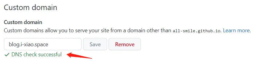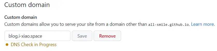 我個人購買的一級域名是 i-xiao ,域名後綴是 space,專門給GitHub Pages 增加一個CNAME記錄(blog),解析二級域名,綁定 <username>github.io 域名。