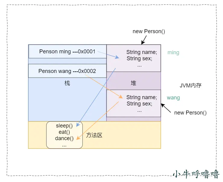 對象ming的 屬性在堆內存,方法在方法區。當我們在通過Person類來 新增一個wang對象時,棧內存會有一個對象名稱wang,來指向在堆內存中 新創建的另一個Person對象,屬性存放在堆內存中。我們可以看出對象ming和對象wang 屬性 2者互不影響,相互獨立。
