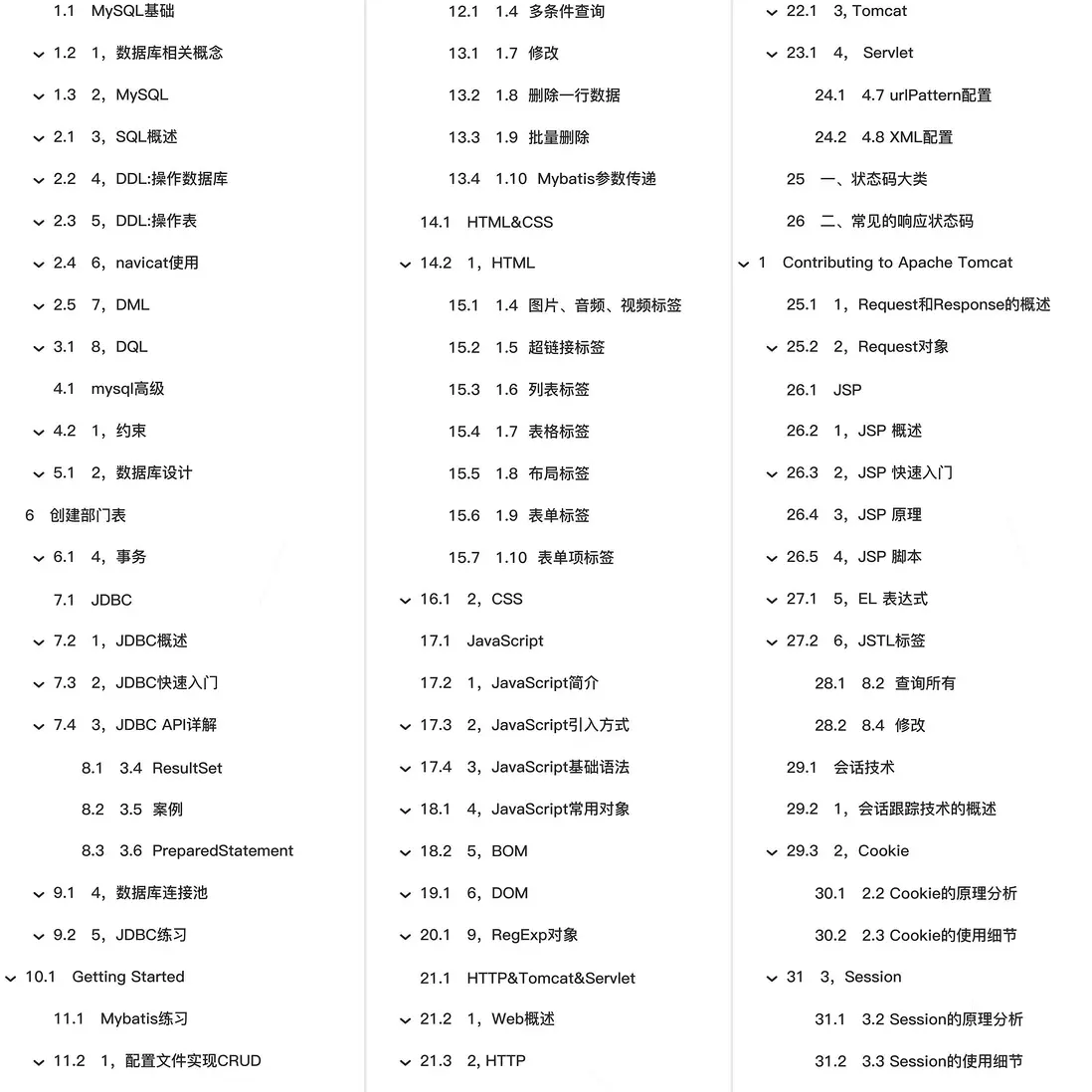 🏆🏆🏆教程全知識點簡介:MySQL基礎 1,數據庫相關概念 2,MySQL 3,SQL概述 4,DDL:操作數據庫 6,navicat使用 7,DML mysql高級 1,約束 2,數據庫設計 創建部門表 4,事務 JDBC 1,JDBC概述 2,JDBC快速入門 3,JDBC API詳解 4,數據庫連接池 Getting Started Mybatis練習 1,配置文件實現CRUD HTML&CSS 1,HTML 2,CSS JavaScript 5,BOM 9,RegExp對象 HTTP&Tomcat&Servlet 1,Web概述 2, HTTP 3, Tomcat 4, Servlet 一、狀態碼大類 二、常見的響應狀態碼 Contributing to Apache Tomcat Code of Conduct How Can I Contribute? 1,Request和Response的概述 2,Request對象 JSP 3,JSP 原理 5,EL 表達式 6,JSTL標籤 會話技術 1,會話跟蹤技術的概述 2,Cookie 3,Session 4,用户登錄註冊案例 Filter&Listener&Ajax 1,Filter 2,Listener 3,Ajax 4,axios 5,JSON 6,案例 VUE&Element 1,VUE 3,綜合案例 1,功能介紹 2,環境準備 3,查詢所有功能 4,添加功能 6,批量刪除 7,分頁查詢
