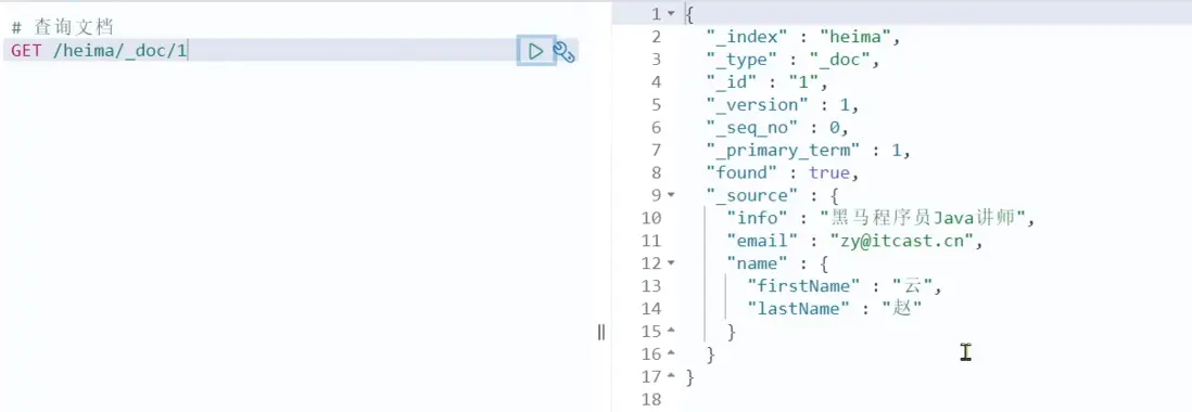 - 查詢文檔:GET /{索引庫名}/_doc/文檔id